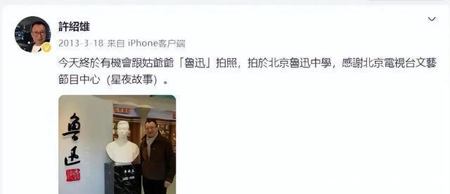 叔公许崇智是国民党元老,参与创立黄埔军校的粤军总司令,与蒋介石和孙中山等人关系密切。 还有另一位叔公许崇清则担任过广州教育局长,同样权力显赫。 他的姑奶奶许广平是鲁迅先生的夫人,所以鲁迅就是他的姑爷爷。 许绍雄曾在社交账号分享了他在北京鲁迅中学与鲁迅雕像的合照,称自己终于有机会跟“姑爷爷鲁迅”拍照。